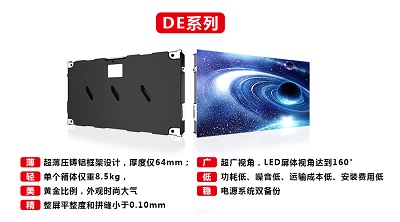 銳尚系列顯示屏每塊模組均擁有獨(dú)立主控芯片,能夠自動讀取和記錄模組的工作數(shù)據(jù),同時(shí)具有錯(cuò)誤偵測和定位等功能。小間距DE系列顯示屏設(shè)計(jì)輕薄,有效減少屏體安裝空間。