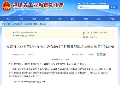 2019年8月26日,福建省工業(yè)和信息化廳公布了2019年省服務型制造示范企業(yè)名單,福建福日電子股份有限公司入選該名單。